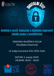 Pozivamo roditelje na predavanje „Edukacija o digitalnoj sigurnosti mladih osoba s invaliditetom“ koje će se održati u Studijskoj čitaonici Gradske knjižnice Solin u srijedu, 2. srpnja (srijeda) s početkom u 18 sati.