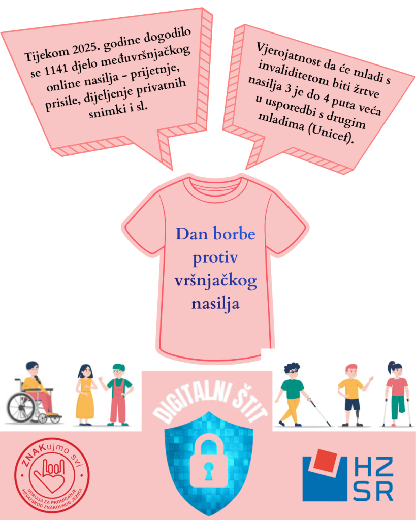 Udruga „ZNAKujmo svi“ odgovara na ove izazove kroz projekt Digitalni štit u sklopu kojeg provodimo edukativne radionice za mlade s invaliditetom kako bi im pružili alate za kritičko razmišljanje i odgovorno online ponašanje. Kroz interaktivne aktivnosti učimo kako prepoznati online nasilje, kako sigurno reagirati i kome se obratiti za pomoć, ali i kako graditi podržavajuće online zajednice u kojima je svaki oblik nasilja jasno prepoznat i neprihvatljiv. Projekt Digitalni štit provodi se s ciljem prevencije online nasilja, jačanja mentalnog zdravlja mladih te razvoja socijalno-emocionalnih vještina potrebnih za sigurno kretanje digitalnim okruženjem, a Udruga ZNAKujmo svi nastavlja biti partner mladima u izgradnji sigurnijeg i inkluzivnijeg digitalnog svijeta.